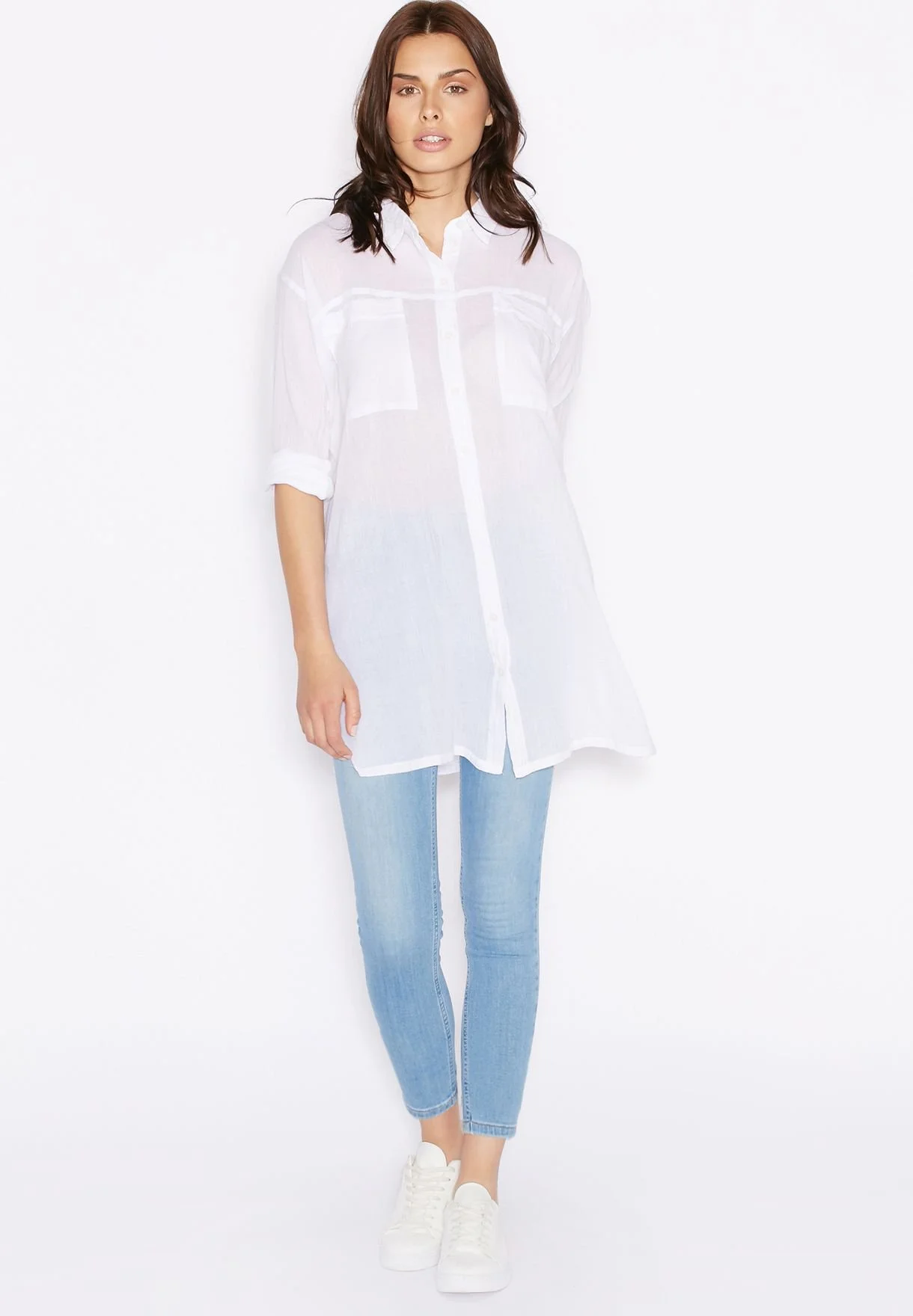 There is something very sultry about a sheerness of a fabric. Play it up or down with what you pair this tunic shirt with. Wear something bold underneath in a contrasting colour for extra sexiness or pair with a simple white tank for a casual look.