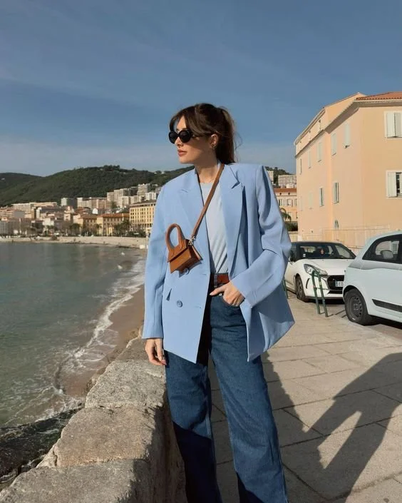 To keep the outfit casual and contemporary, you can style the light blue blazer with sneakers for a laid-back vibe. Pair it with relaxed-fit jeans or casual trousers for an effortless yet stylish look. Layering with a simple t-shirt or a striped top can add visual interest while maintaining a relaxed feel. Finish the outfit with minimal accessories and a crossbody bag for practicality and comfort. Whether you choose soft colours, bold hues, or casual sneakers, the light blue blazer offers endless styling opportunities to express your personal style with confidence.
