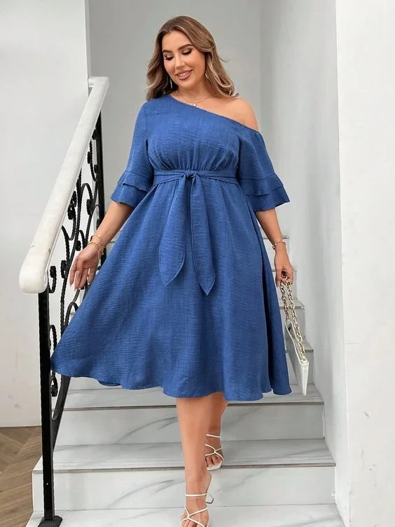 To style an azure blue off-shoulder midi dress for winter, begin by layering it over a cream long sleeve top. This practical approach not only adds warmth but also creates a visually appealing contrast between the soft cream and vibrant blue. The long sleeve top helps maintain the dress's off-shoulder design while keeping you cosy.