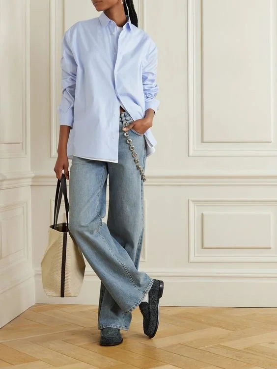 For a winter look with a blue stripe shirt, layering is key. Start with a fitted turtleneck underneath the striped shirt in a neutral colour like white, black, or grey. This adds warmth and creates a sleek foundation that contrasts nicely with the stripes.