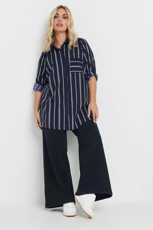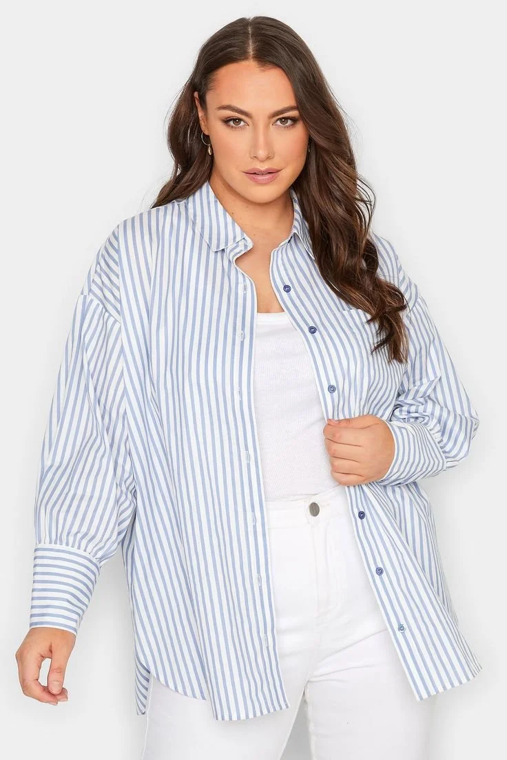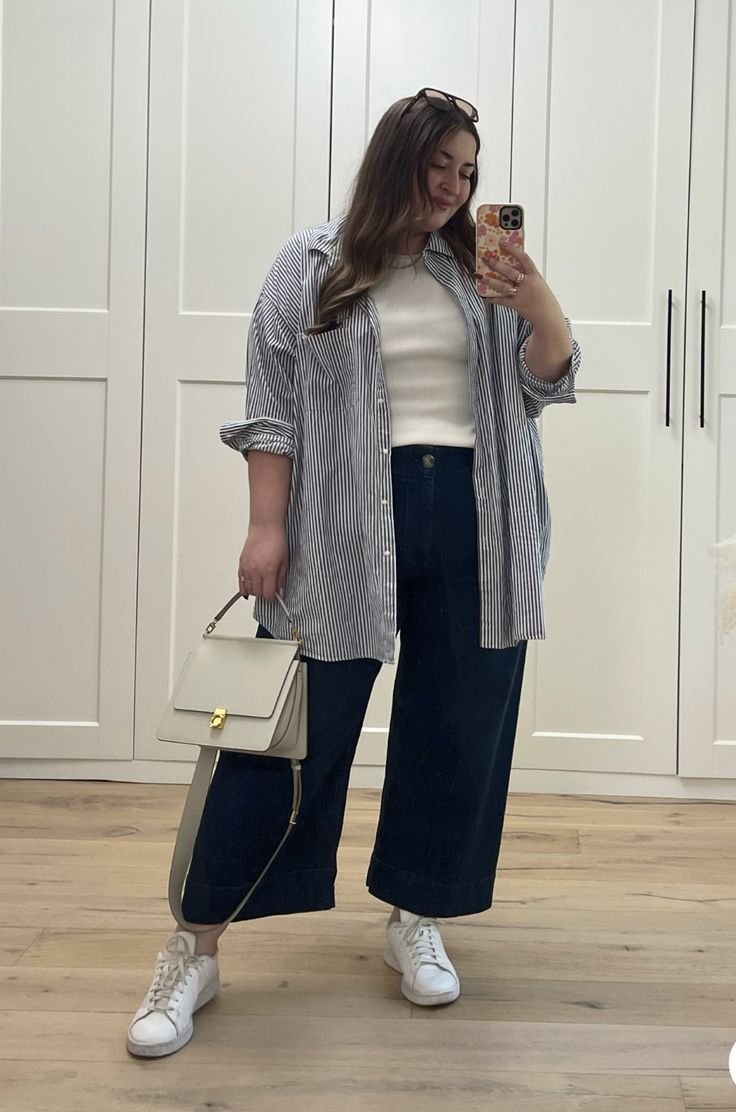 For bottoms, you can opt for denim jeans or tailored trousers in light or dark washes. White or beige chinos also create a fresh, spring-ready look. If you want something more stylish, a classic black skirt or shorts can add contrast while keeping the outfit polished. For a more relaxed vibe, consider pairing the blue striped shirt with high-waisted shorts or a flowy midi skirt in complementary tones like blush pink, soft yellow, or even muted greens.