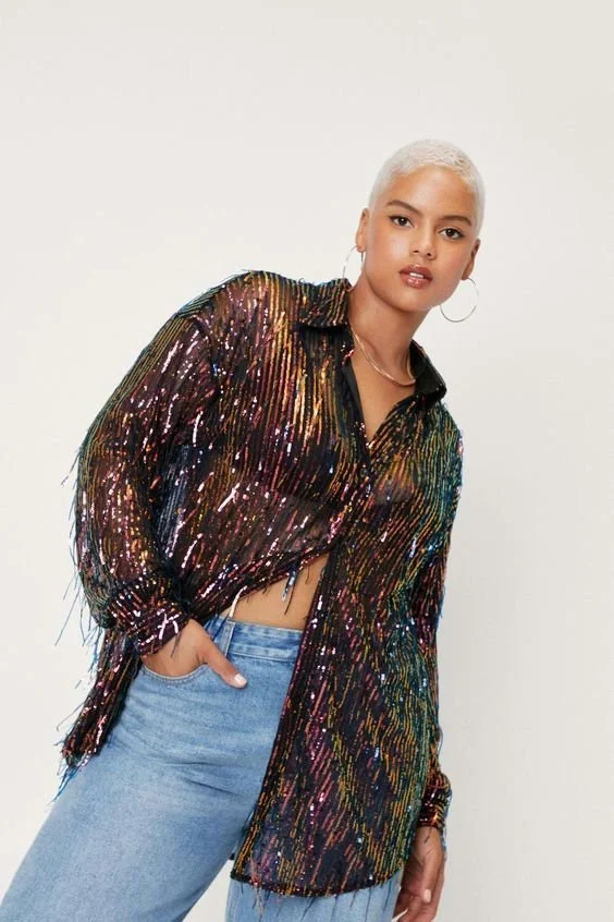 To elevate your summer style, experiment with textures or patterns for a more eclectic and personalized look. Consider pairing the glittery polo shirt with a textured denim skirt or distressed denim for added visual interest. Alternatively, inject a playful spirit into your outfit by combining the vintage shirt with patterned denim, such as floral or geometric prints, creating a unique and eye-catching ensemble perfect for sunny days.